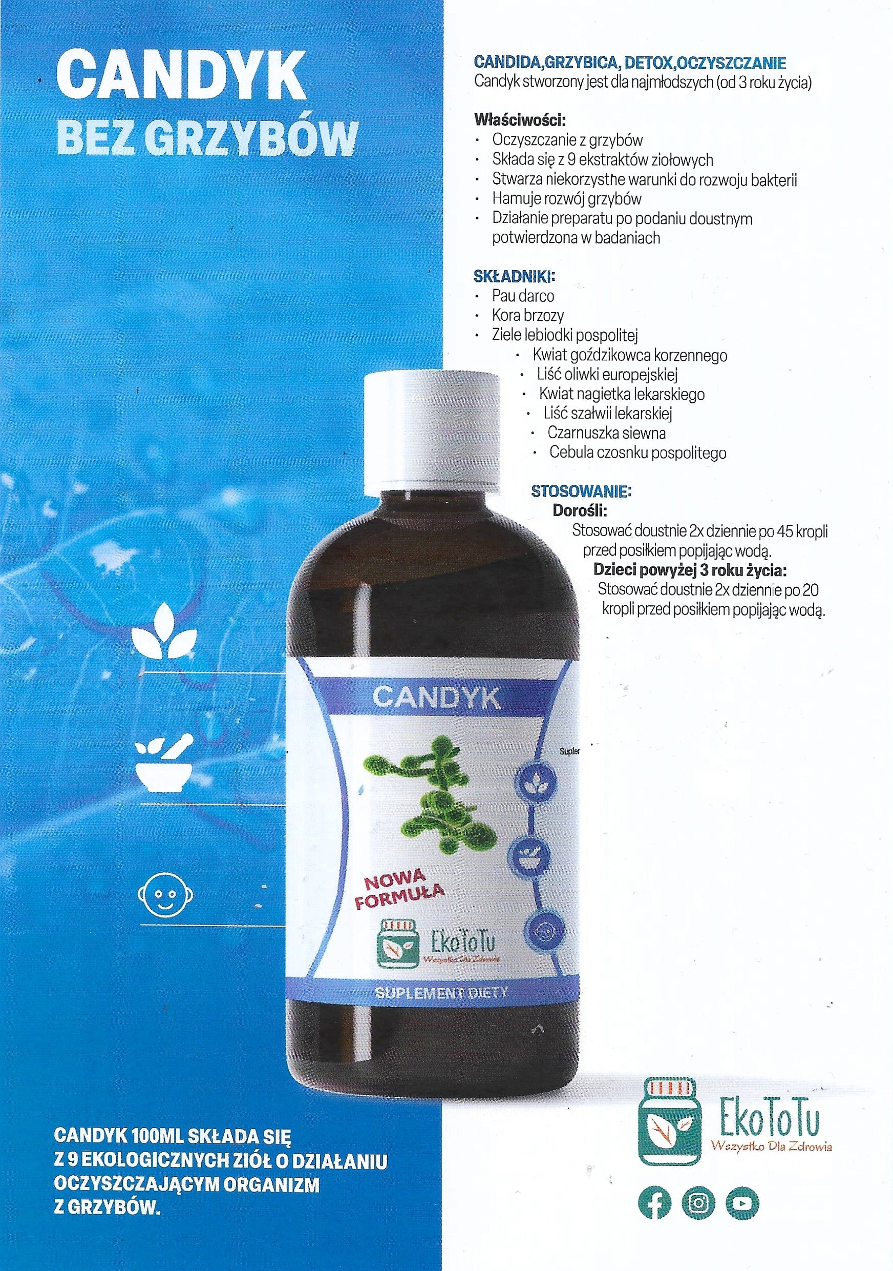 Candyk to suplementy diety składający się z 9 ekologicznych ziół o działaniu oczyszczjącym organizm z grzybów. Dzięki zawartości kory brzozy, ziela oregano i liści szałwii lekarskiej wspomaga prawidłowe trawienie. Poza tym obecne w produkcie kwiaty nagietka lekarskiego pozwalają zadbać o zdrowie jelit.